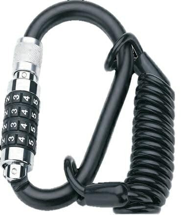 Karabińczyk z zamkiem szyfrowym otwierany na zewnątrz, dołączona linka grubość 4 mm, długość 1200 mm, w zestawie uchwyt, dla jednoczesnego zabezpieczenia kasku, bagażu, siodełka lub kół.